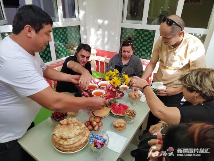 参访团一行在喀什古城百年老茶馆观看歌舞表演,和游客一起品茶。“喀什的风景美、食物好吃,我非常喜欢这里的生活,也感受到了人们的喜悦和幸福。”8月31日,黎巴嫩《消息报》编委委员阿米尔·穆赫森在喀什市帕哈太克里乡稻香泉村一家农户家访时说。