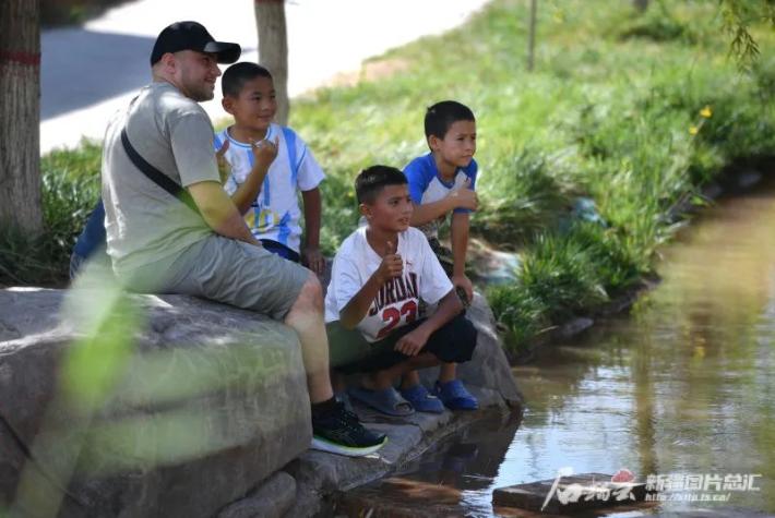参访团成员在喀什市帕哈太克里乡稻香泉村与小朋友们合影。