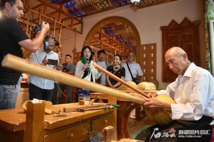 参访团一行在“中国新疆民族乐器村”——疏附县吾库萨克镇托万克吾库萨克村观看传统乐器制作过程。