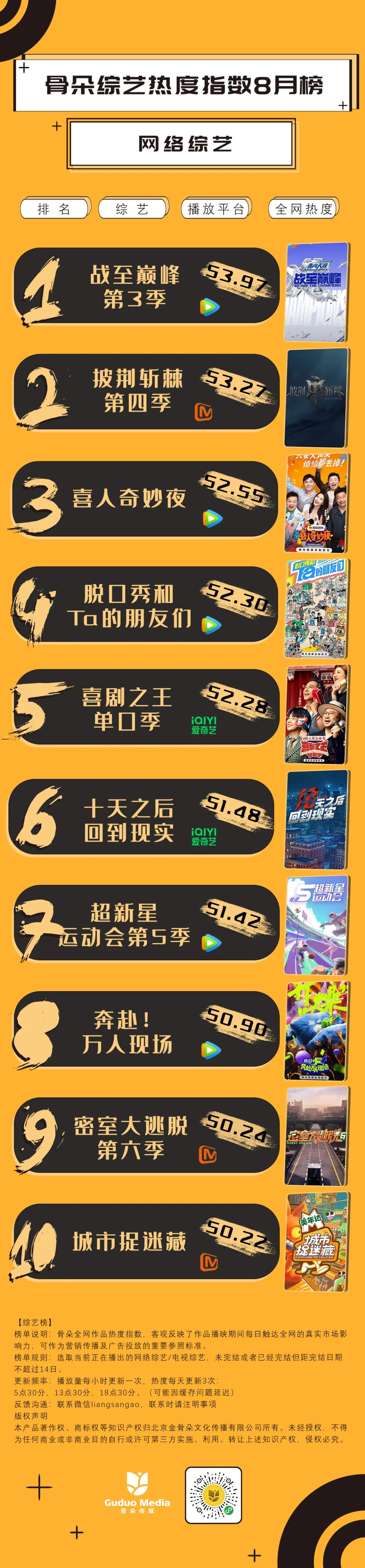 骨朵网络影视向上滑动看下一个原标题:《网综月榜丨《战至巅峰第3季》夺冠,《脱口秀和Ta的朋友们》开始发力》