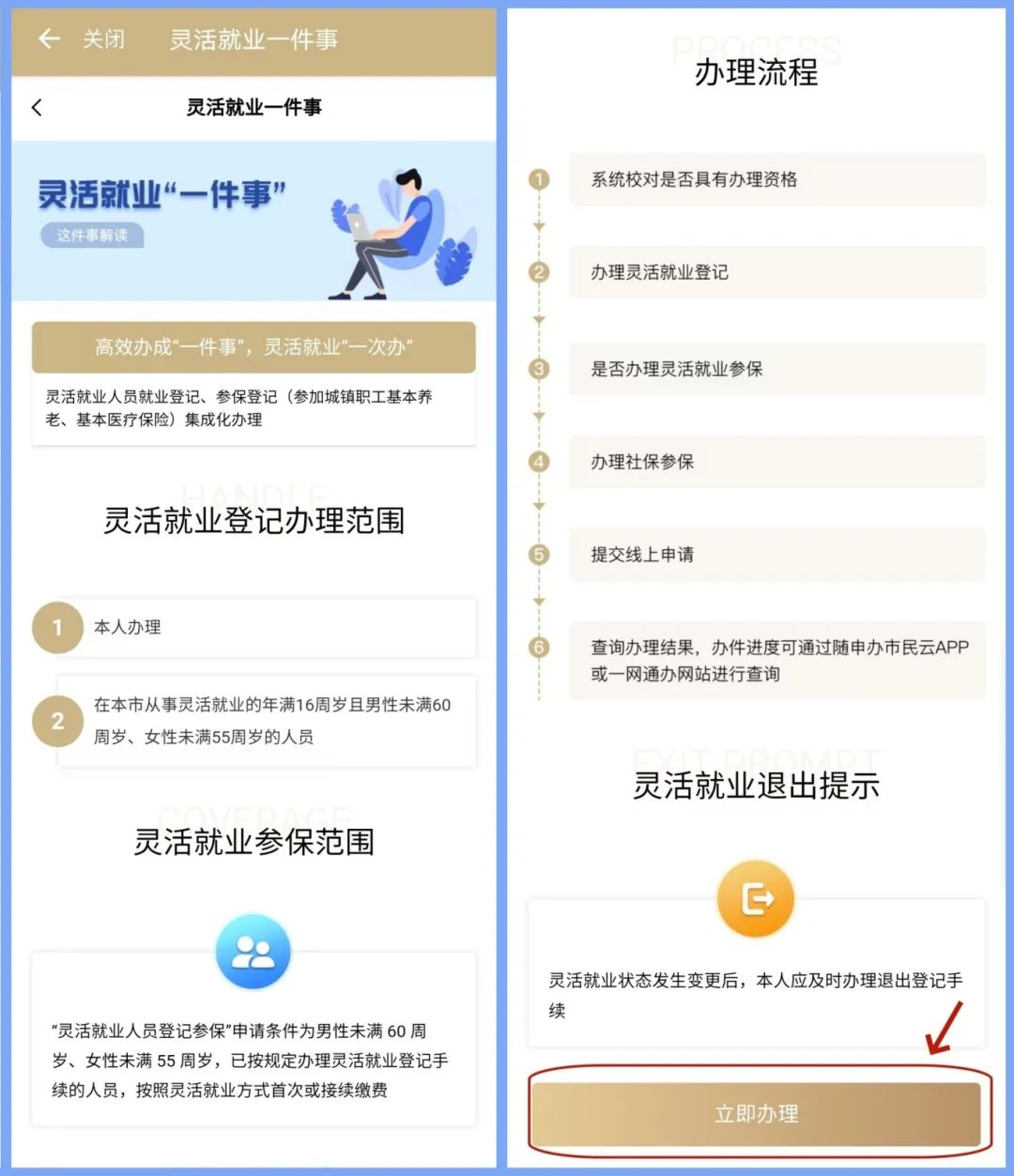 第一步:登录“随申办市民云”APP,搜索“灵活就业一件事”进入办理功能,选择“灵活就业登记参保”,阅读相关办事指南后,点击下方【立即办理】,即可进入办理页面。