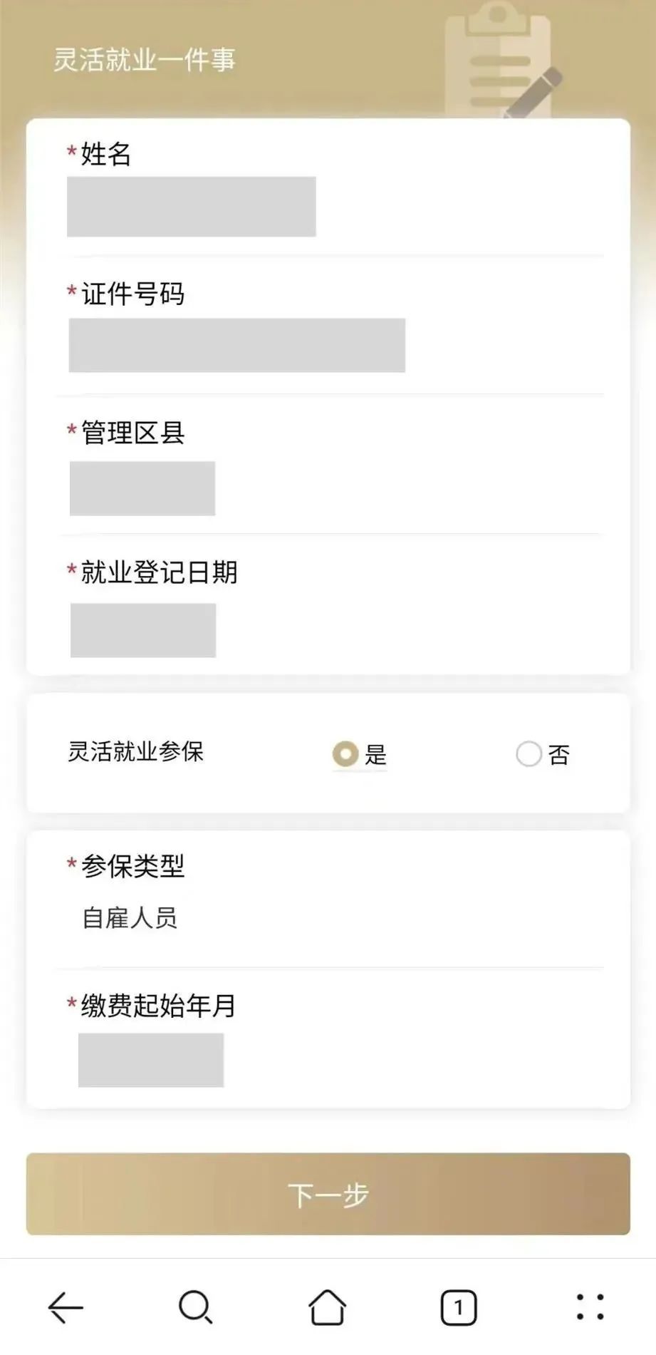 第二步:核对【姓名】【证件号码】【就业登记日期】信息后,根据本人实际情况,选择对应【管理区县】,并在【灵活就业参保】选项内选择【是】后,系统将自动生成缴费起始年月。点击“下一步”。