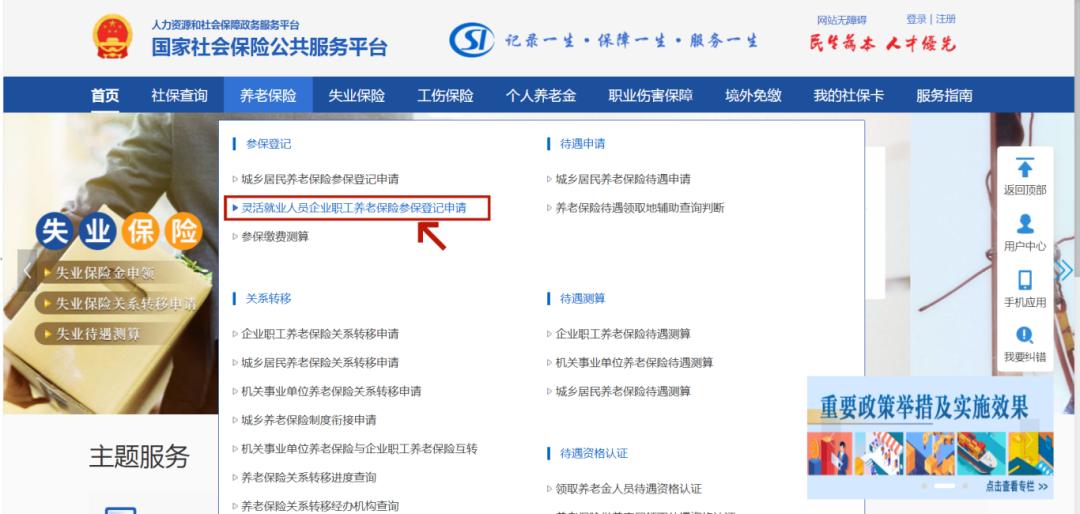 ②国家社会保险公共服务平台登录“国家社会保险公共服务平台”(网址:http://si.12333.gov.cn),选择“灵活就业人员企业职工养老保险参保登记申请”事项进行办理。