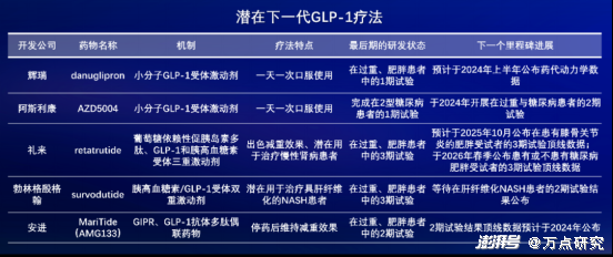 目前,全球有超过220项GLP-1类药物正在研发,大部分面向糖尿病、肥胖症的治疗。这其中,中国药企热情高涨,48项药物在研、名列第一,且有20多项进入临床阶段。如信达生物(01801.HK)已经提交了上市申请,还有万邦医药(301520.SZ)、恒瑞医药(600276.SH)、先为达等,并且已经推进至临床第三期。其他国内外药企,也在同步研发GLP-1口服药物,如恒瑞医药(600276.SH)、海思科(002653.SZ)、信立泰(002294.SZ)等都在做临床前中期的研究。