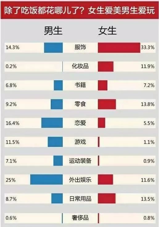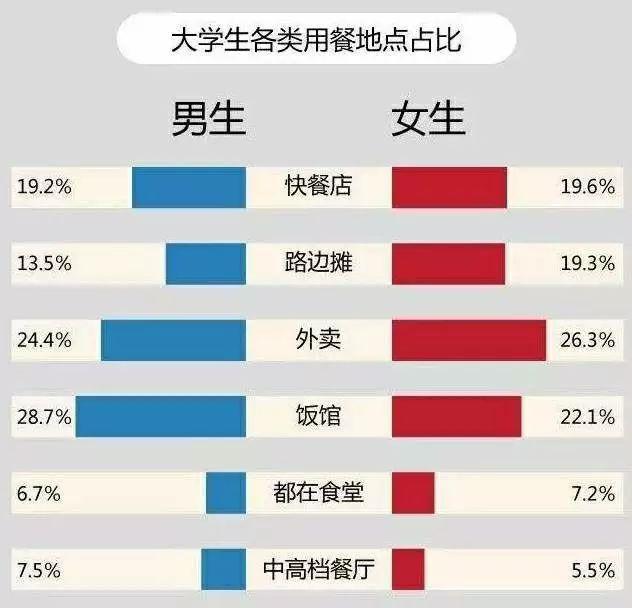 有网友总结了大学生日常支出占比,可以看到吃饭占了大头,除此之外还有娱乐、旅游、形象消费等等。如果恋爱了,也是一笔不小的开支。而在吃饭方面,男女选择用餐地点大有不同。