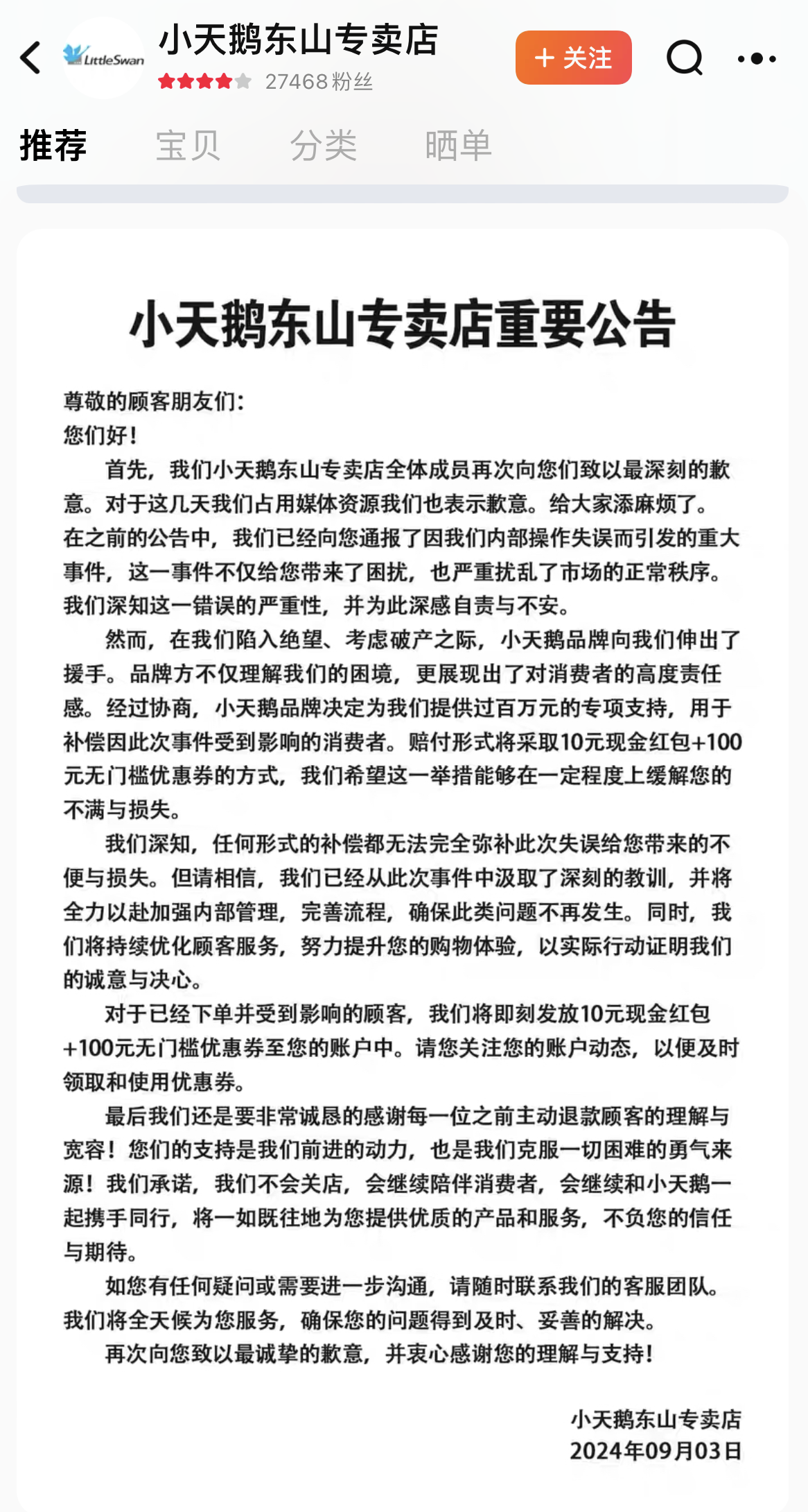 9月3日,“小天鹅东山专卖店”发布最新公告称,针对此前因内部操作失误引发的重大事件,小天鹅品牌方伸出援手,决定为店铺提供过百万元的专项支持,对于已经下单并受到影响的消费者,即刻采取发放10元现金红包+100元无门槛优惠券的形式予以赔付。消费者可在“薅羊毛”群内看到低价消息