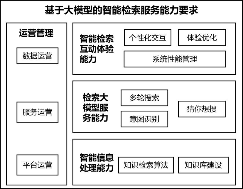 基于大模型的智能检索服务能力要求评估面向四个方面,分别是:一是智能信息处理能力,二是运营管理,三是检索大模型服务能力,四是智能检索互动体验能力。