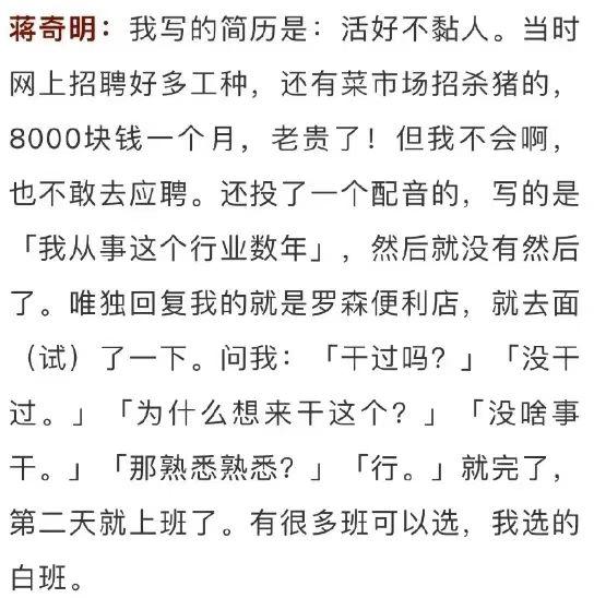 当时他在网上看了无数工种,从菜市场杀猪到线上配音,但投出去的简历都杳无音信。最后只有一家便利店回复了他,蒋奇明去面试完,第二天就开工了。