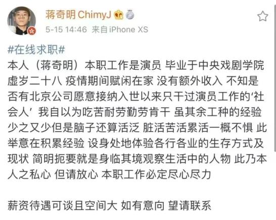 新冠疫情暴发那一年,线下演出进入寒冬,刚签公司没多久的蒋奇明一时间没戏拍也没钱赚,无奈之下只好去打零工。