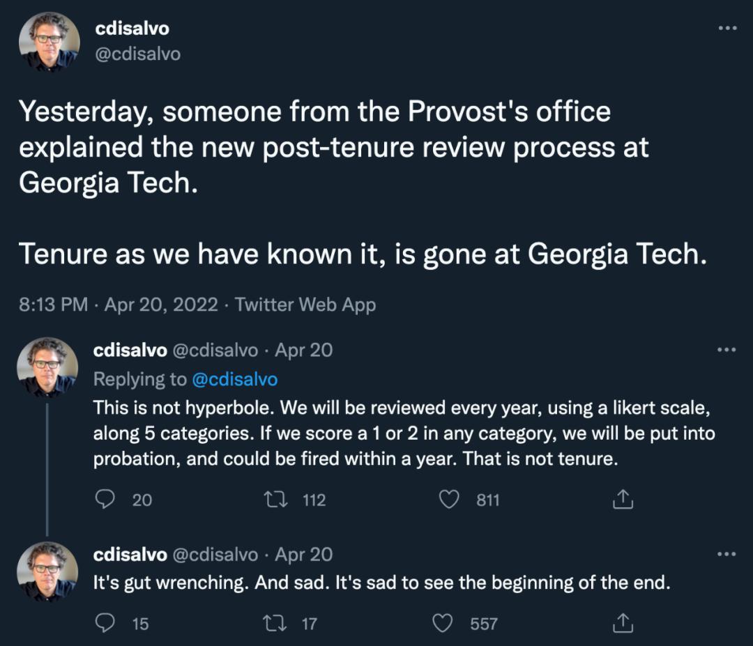 除了佛罗里达州,美国其他州也未能幸免。2021年,主管佐治亚州26 所公立高等教育机构的董事会批准了一项任职后审查的变更政策:效率低下且贡献不足的终身教职员工,可在没有常规听证会的情况下被解雇。2022年,该州的佐治亚理工学院副教授 Carl DiSalvo证实了此事,他发文:“佐治亚理工学院也要实行新的任期后审查程序了,如果任何一项得分为 1 或 2 ,我们可能在一年内被解雇。”