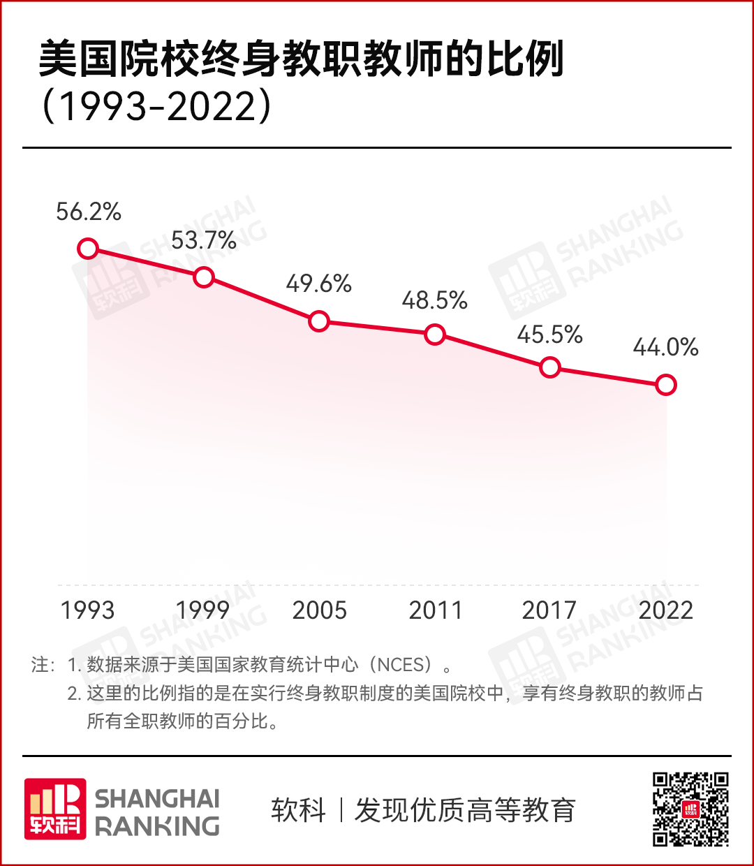 美国国家教育统计中心(NCES)官方数据显示,美国大学的终身教职制度呈现出消减态势。在目前实行终身教职制度的美国院校中,享有终身教职的教师占所有全职教师的比例已不足一半,从1993 年的56.2%,下降为2022年的44%,降幅超过12个百分点。