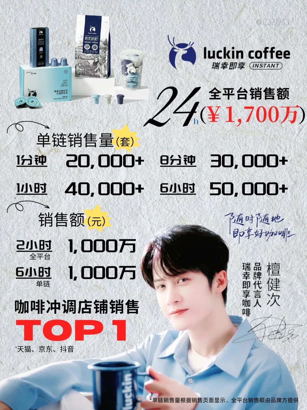 以《四方馆》热播和巡演霸屏热搜的檀健次同样今年收获颇丰,不仅有奢侈品品牌戴比尔斯、皇家哥本哈根、PRADA的青睐,也包揽出行、鞋服、洗护等多个品类,代言瑞幸即享咖啡官宣后2小时,销售额就突破1000万,足见粉丝群体的粘性与超强购买力。