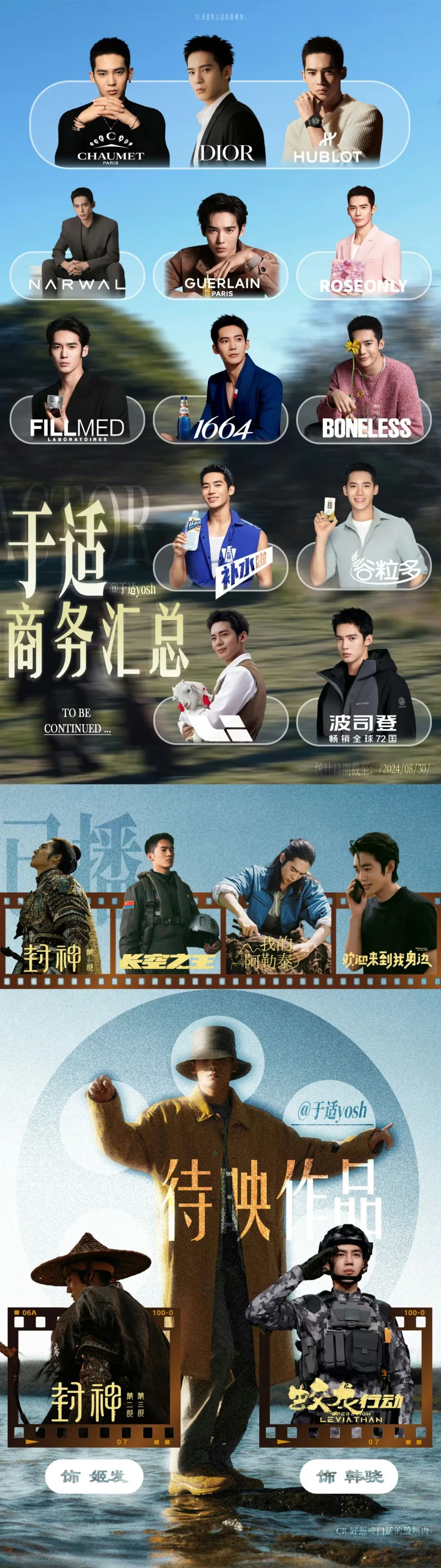 同样能证明其商务能力的还有各大品牌的超长续约期,百雀羚8年、植村秀6年、奥迪5年、红米5年......多年“品牌情谊”无一不佐证了耶啵在商务赛道,十分坚挺。以《封神》系列、《我的阿勒泰》爆火的新晋小生于适爆发力惊人,作品口碑与商务实绩是其斩获11个新增代言的必要一环,最近官宣加入漫改大IP电影《镖人》,与李连杰、吴京、谢霆锋等前辈同台飚戏,于适的资源和前途均未来可期。