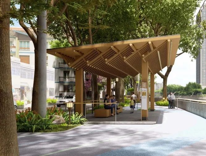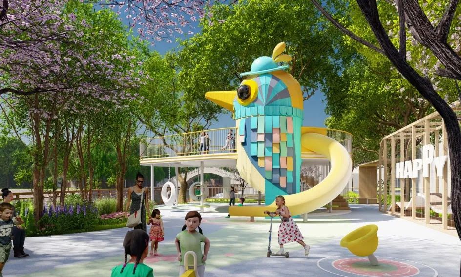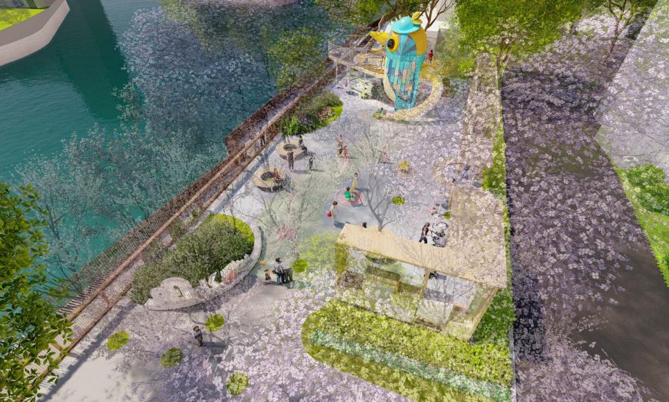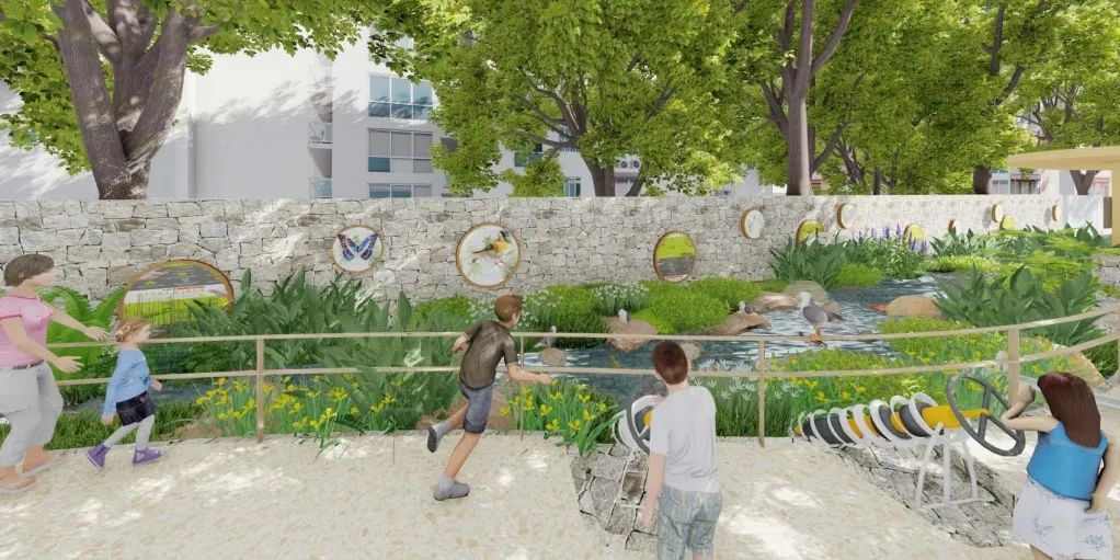 (效果图)儿童友好的理念贯穿在各个景观节点建设中。靠近桥下运动空间的“雨石花间”区域,增设科普主题驿站,还配有儿童室内生态多媒体展陈空间。同时,结合场地现有条件,打造三级雨水花园,通过科普标识展现雨水的生态循环。
