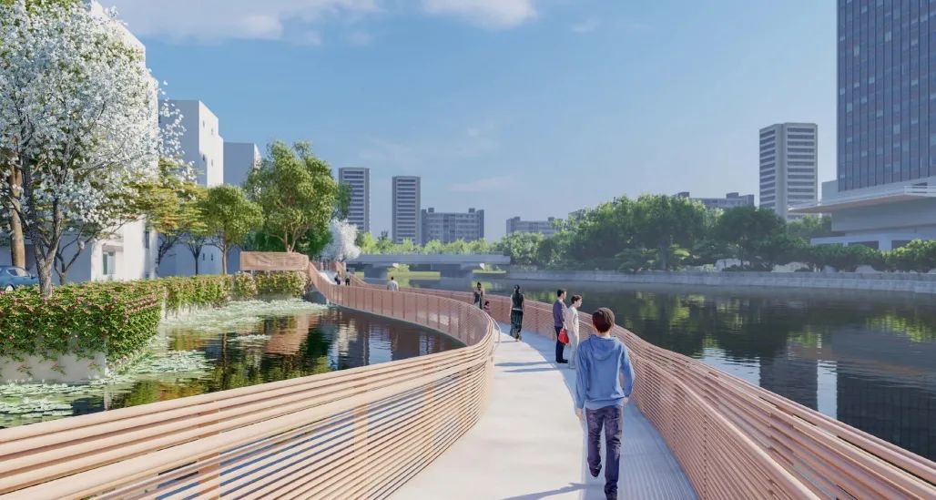 (效果图)整个慢行系统的道路将被拓宽到2.5米,桥上桥下以浮桥进行连接。同时,在羊腰湾路、五爱家园、北塘大街段等节点都将实现无障碍贯通、骑行贯通,也会设置方便停车的区域。