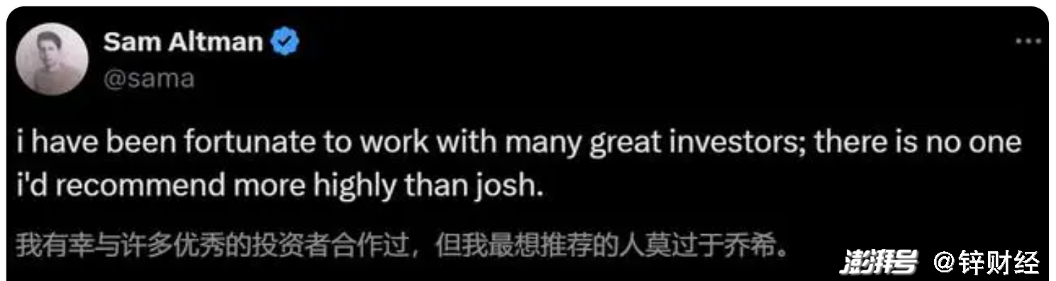 山姆·奥特曼对约书亚·库什纳和Thrive Capital非常信任,甚至在社交平台上,公开“吹捧”:“我有幸与许多优秀的投资者合作过,但我最想推荐的人莫过于乔希(约书亚·库什纳)。”