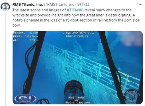 皇家邮轮泰坦尼克号公司9月2日在社交媒体平台X说,最新勘测显示,“泰坦尼克”号船头左舷一侧有一段约4.5米长的栏杆已经掉落。