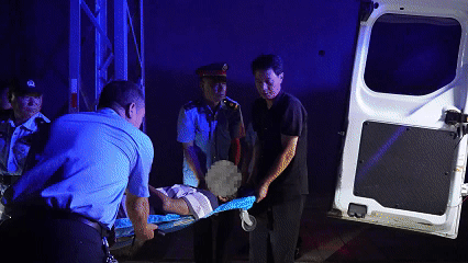 将旅客抬上救护车