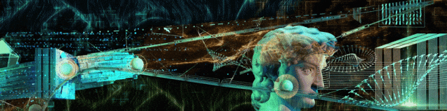 在“城的旋律”中,人类璀璨文明的符号成为视觉中心:吉萨金字塔建筑群柱、显微镜、早期飞行工具飞艇、热气球……数字化的大卫雕像作为人类的缩影,并辅有发电机、基因、未来飞船等更现代的元素,诠释属于全人类的文化成果。