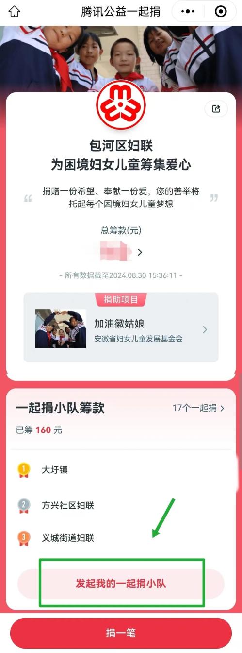 识别小程序码,进入“腾讯公益”“包河区加油徽姑娘”页面。选择“发起我的一起捐小队”以“包河区某某单位”的名义组建爱心团队,团体名称和头像可更换。