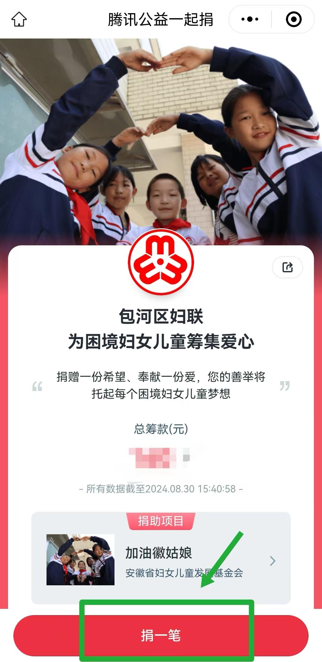 识别小程序码,进入“腾讯公益”“包河区加油徽姑娘”页面。向下滑动页面,点击下方“捐一笔”按钮。