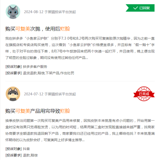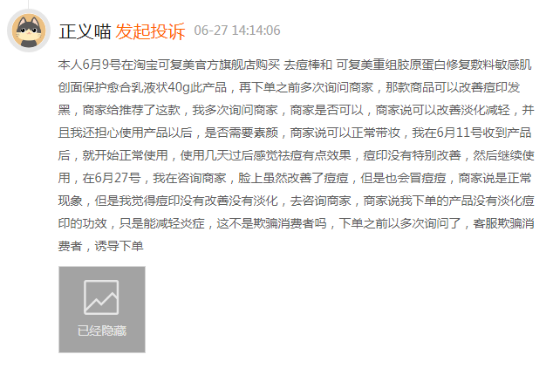 可复美产品近期因“烂脸”被投诉