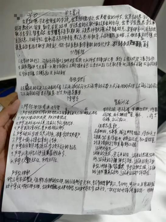 ●特训学校要求学生每天背诵默写誓词、守则等。讲述者供图她学会了沉默,“听到那些很恶心的话或被体罚时,强迫自己从现实里抽离出来”。这种淡漠又服从的态度让秦麦得到教官的欣赏,她被频繁带离学校前往办公区,协助工作人员整理资料,在那里她不仅能接触电脑,活动相对自由,为后来逃跑创造了机会。