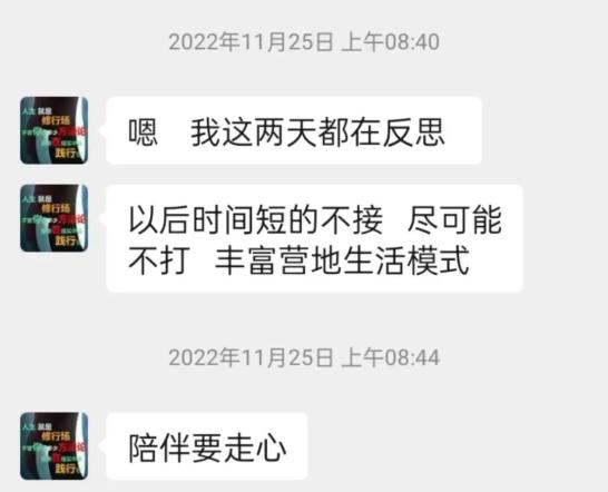 过了两个月,徐秋菊始终没办法接受学校对待孩子的方式,提出辞职。她曾和景海永严肃提到,孩子遭遇殴打后的心理创伤问题,两人的聊天记录显示,景海永说自己这两天都在反思,“以后尽可能不打”“陪伴要走心”。