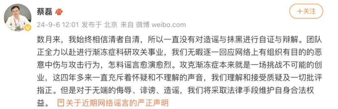 诊断书 @蔡磊声明表示,攻克渐冻症本来就是一场挑战不可能的创业,团队理解和接受质疑及一切批评指正,但对于无端的恶意侮辱、诽谤、造谣,将采取法律手段维护自身合法权益。声明提到,本次为官方唯一公开澄清,今后若再有类似子虚乌有的造谣、侮辱、诽谤情况发生,不再一一自证,将通过律师直接启动法律程序,一律进行报警、诉讼和联系平台进行处理,相关账号将面临民事乃至刑事责任的追责。