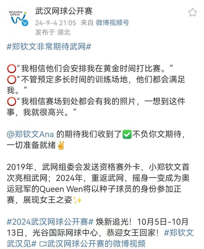 对于郑钦文的期待武网表示:安排!不负期待!