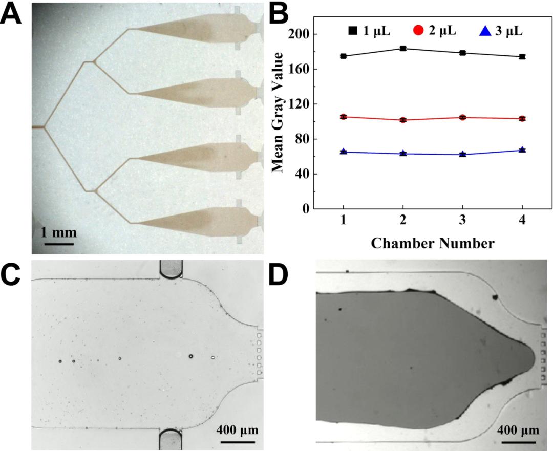 (B)不同体积的磁珠在四个腔室中的平均灰度值(C)在有两个矩形腔室和(D)没有两个矩形腔室的情况下,磁珠在等分腔室中的残留情况