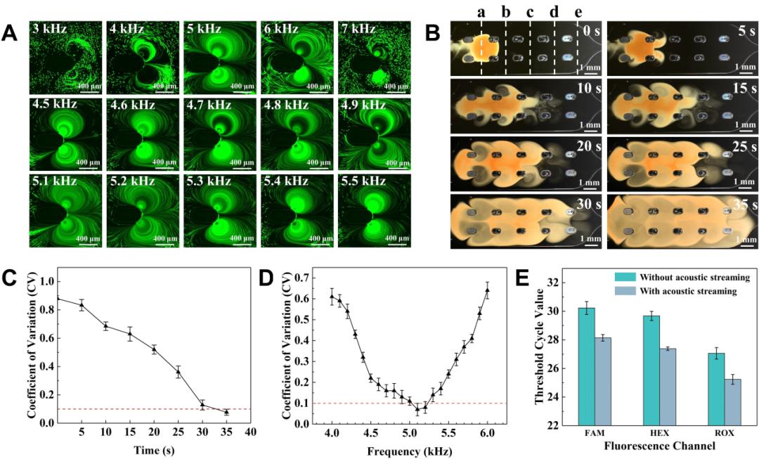 卞晓军解释,该芯片实现磁珠高效混合的方式主要包括以下六个方面,分别是微柱设计、气泡捕获阵列结构、声流驱动混合、共振频率的应用、油相驱动、微柱间隙的优化。通过上述设计和操作,该芯片能够在大约35秒内实现磁珠的高效混合,为后续的核酸提取和检测提供了均匀的磁珠混合物。