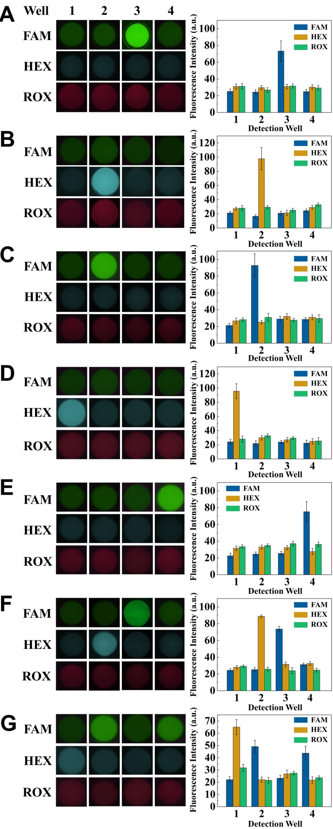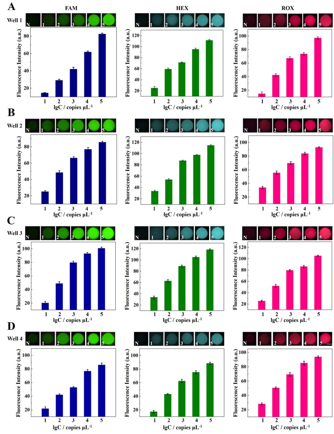 使用荧光显微镜读取FAM、HEX和ROX通道的片上荧光结果。图A、B、C和D分别对应1、2、3和4号孔。误差条表示至少3次重复实验的标准偏差