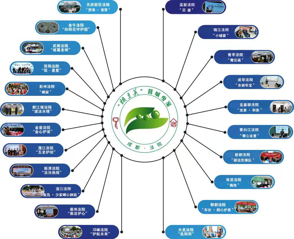 (一)打造形成“一院一品”的品牌矩阵在成都中院“豌豆荚”品牌示范下,全市22家基层法院结合自身少家审判工作实际,坚持一院一品,陆续打造出武侯“诸葛老师”、金牛“向阳花守护团”、简阳“简·星星”、彭州“巧姐工作室”、蒲江“五老护幼”等诸多根植特色土壤的蓉城少家审判子品牌,共同铸就成都法院“豌豆荚”少家审判司法保护品牌矩阵。