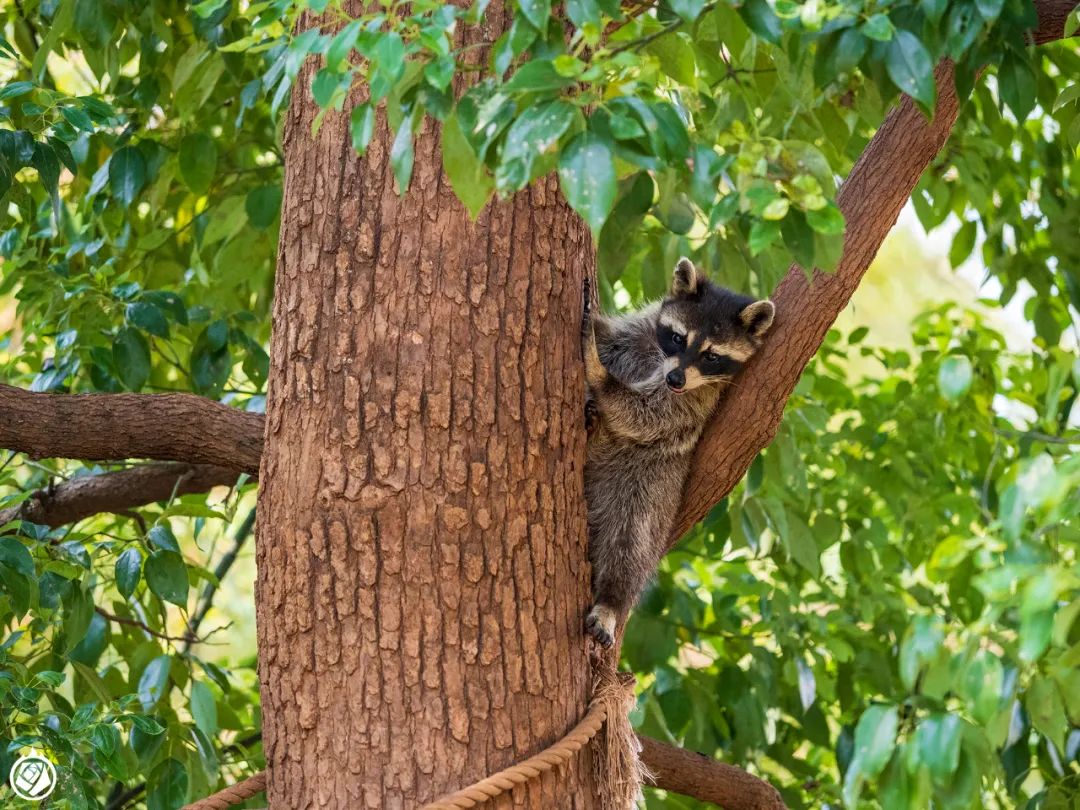 长沙生态动物园的浣熊展区很有意思,很少有这样浣熊待遇比小熊猫好的动物园。这个展区里有两棵大树,大树上完全没有电网、反扣格挡等隔离设施,浣熊想爬多高就能爬多高。两棵树之间有软绳做的桥,能让它们爬来爬去。地面上,有水泥桶充当巢穴,浣熊也喜欢钻进去待着。