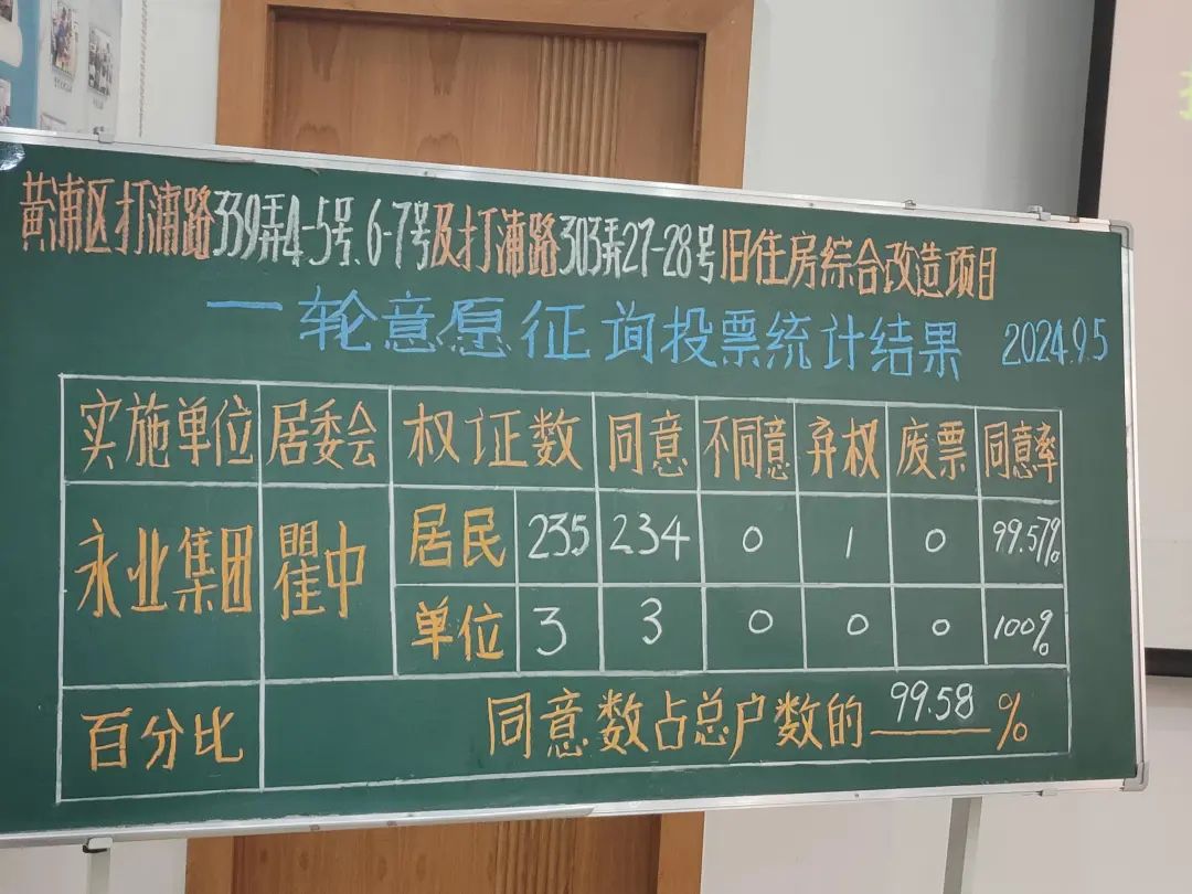 上午10时许,经过短暂的开箱计票,结果产生:应发户数238户,实发户数238户,同意票237张,同意率99.58%。根据《上海市旧住房成套改造和拆除重建实施管理办法(试行)》《黄浦区旧住房成套改造和拆除重建操作规程(试行)》等规定,该项目将正式启动旧住房改造工作。