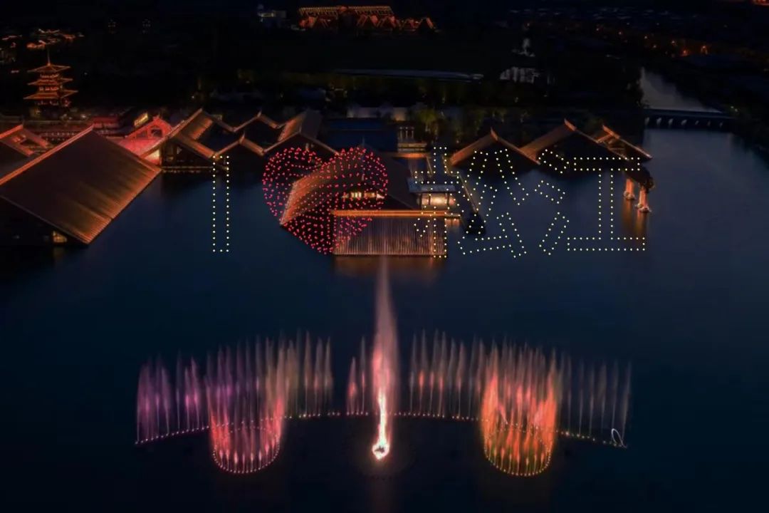 上海光影节松江分会场开幕式仪式于9月23日晚在广富林文化遗址举行,以松江的自然风光和人文景观为背景,富林湖的彩色喷泉和画舫为水中互动场景,结合建筑光影秀和空中无人机表演,营造出立体的视觉盛宴。
