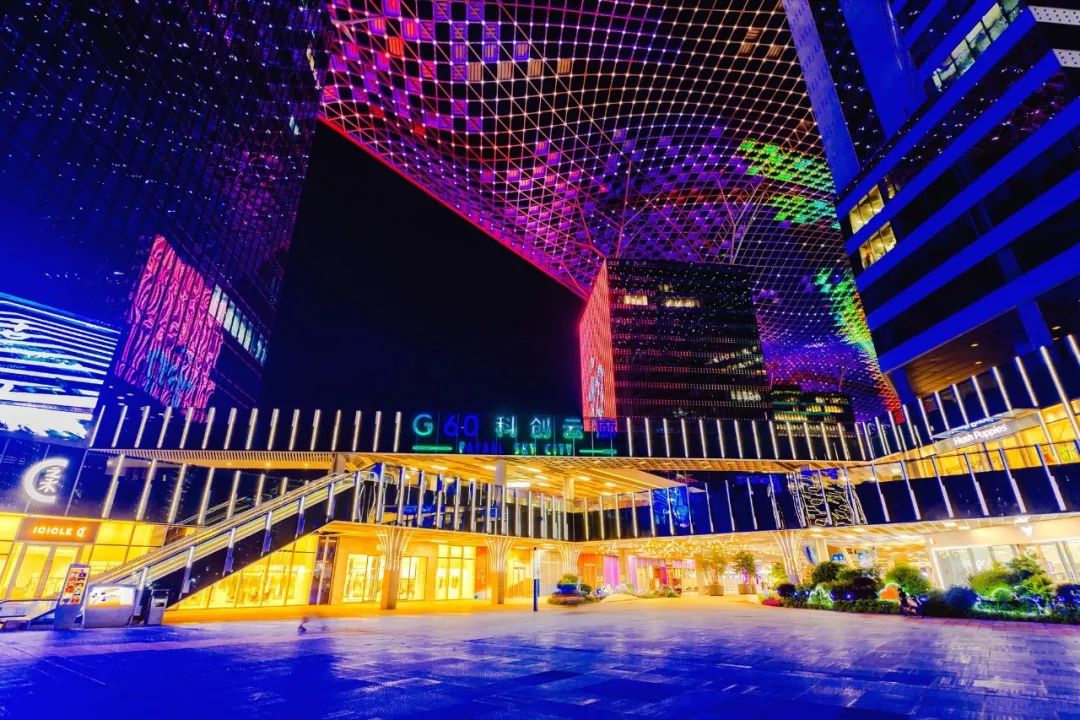 G60科创云廊是松江的标志性建筑。光影节期间,壮观的云廊灯光秀将整个建筑群映照得如梦如幻。变幻的天幕、流动的灯光宛如松江科技创新的象征,让你沉浸在现代感与未来感的视觉冲击中,感受这座科创园区的蓬勃生机。
