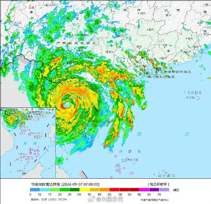 9月7日08时,今年第11号台风"摩羯"(超强台风级)中心位于北纬20点4度,东经108点2度,也就是在距离越南广宁省下龙市东偏南方向约130公里的北部湾海面上,中心附近最大风力16级,达到52米每秒的风速,中心最低气压935百帕,八级大风范围半径约210公里,十级大风范围半径约80公里,十二级大风范围半径约30公里。