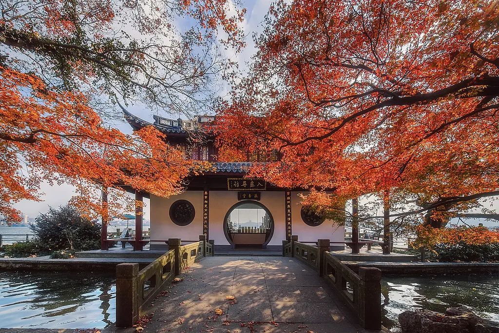 穿过圆拱门,枫树正临湖照影,向着湖面涟漪探出工笔画般疏密有致的枝桠。层叠红枫热烈胜火,在白墙黑瓦的映衬下,奏响秋日江南独有的生命之歌。孤山路-浮光跃金