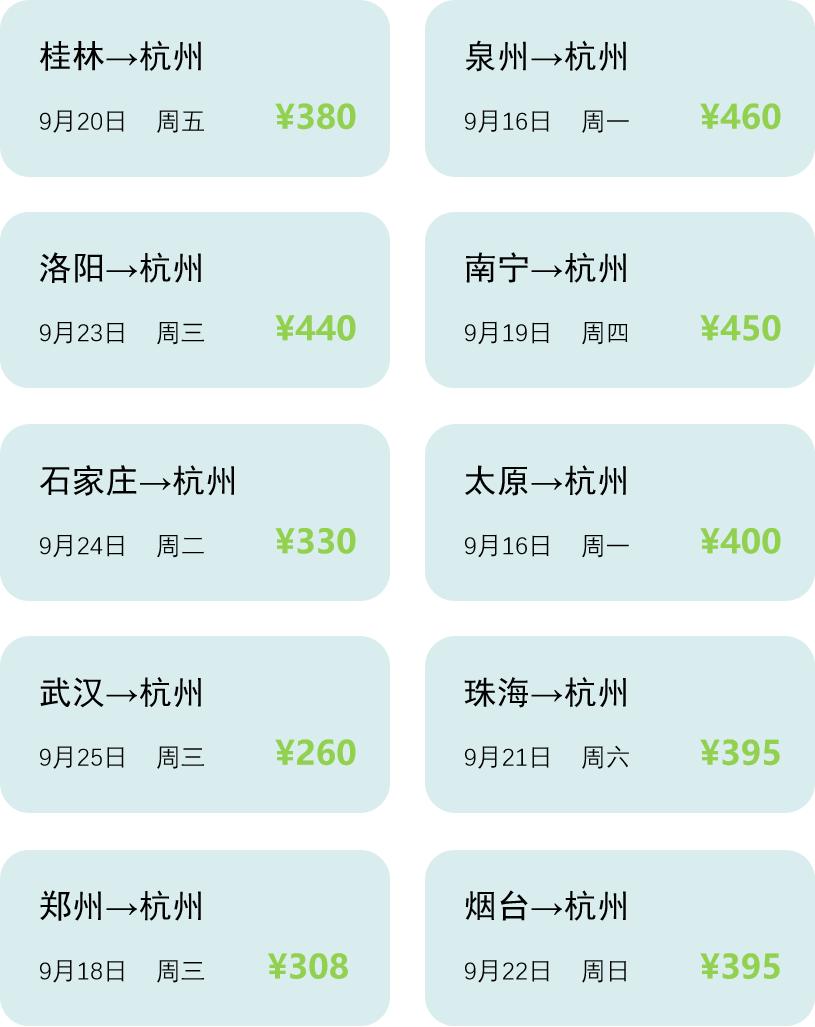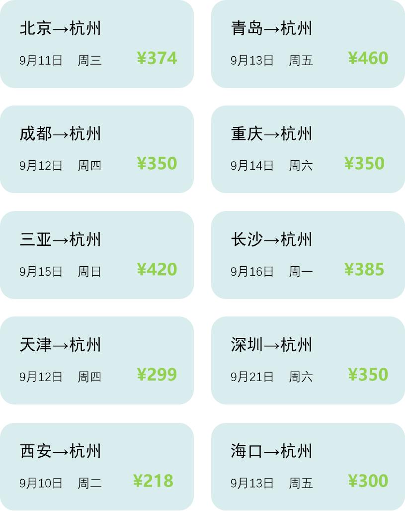 铛铛,最重要的“压轴戏”来啦!小编整理了系列近期平价来杭航班,在即将到来的秋天,期待与自五湖四海而来的朋友们相逢。