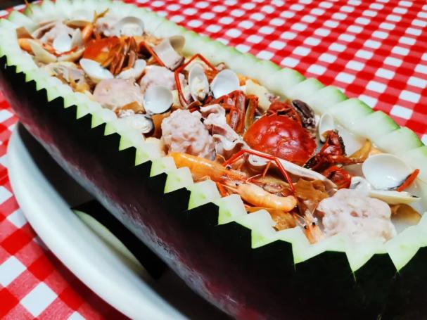 冬瓜船黑皮冬瓜是三水的国家地理标志农产品,而冬瓜船就是三水的特色美食。将冬瓜打横放置,打造出“船”的效果,视觉效果拉满。冬瓜船里可加入河鲜、鸡肉等多种食材,能满足不同食客的喜好,因此大受欢迎。