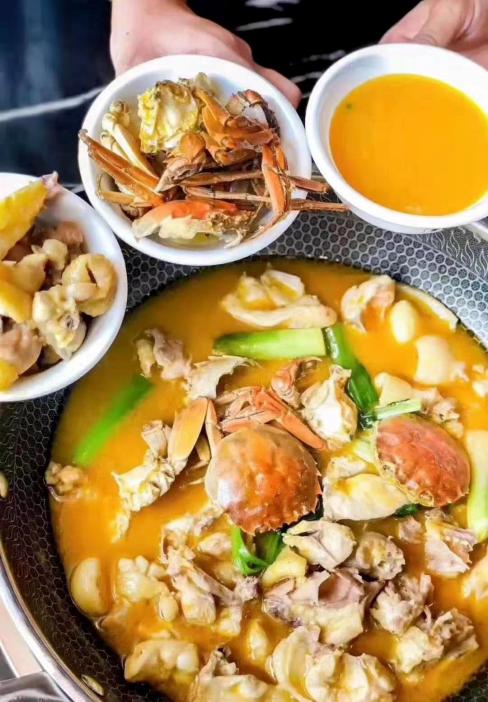 鸡煲蟹古人说“蟹为五味俱全之物,其鲜无比”,白坭鸡煲蟹取材果园走地鸡,加上满满蟹膏蟹油的西江毛蟹,配上独有的汤汁,汤色金黄,入口顺滑浓稠,鲜香四溢。