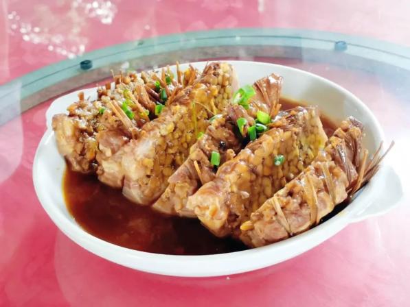 禾秆冚珍珠“禾秆冚珍珠”,是一句粤语,形容珍贵的物品被掩盖,又叫“禾草扎猪肉”,是一道非遗美食,主要选用上乘的绿豆,放进优质的本地土猪肉中,再以禾秆草包扎好,放入秘制的浓汤中煮制而成,是疍家菜系中“浸”技法的代表。