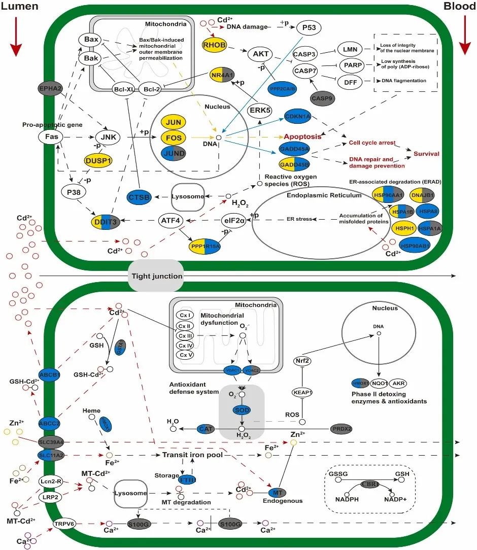 环境中的有毒金属通过各种途径进入食物链,并可能对人体造成多种危害,例如镉过量摄入引起骨脆性或肾损伤,铅会导致肾、脑中毒(神经胶质瘤)等。某些特定膳食补充剂(维生素族、抗氧化剂、矿质元素)具有缓解重金属胁迫和毒性的作用,但其对肠道过程中降低重金属生物有效性的影响机制尚不清楚。