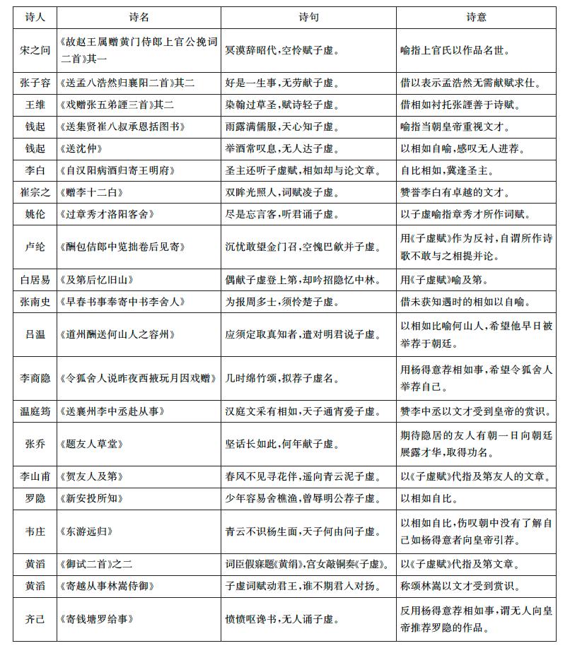 其次,自儒家思想层面而言,《子虚赋》的“讽谏”诉求以及给司马相如带来的人生际遇的转折,成为后世文学作品歌咏的对象。自左思《咏史》“著论准《过秦》,作赋拟《子虚》”始,“子虚”成为文人才华的彰显和个人际遇的表征,这在唐代文人身上表现得尤为突出,以《全唐诗》为例: