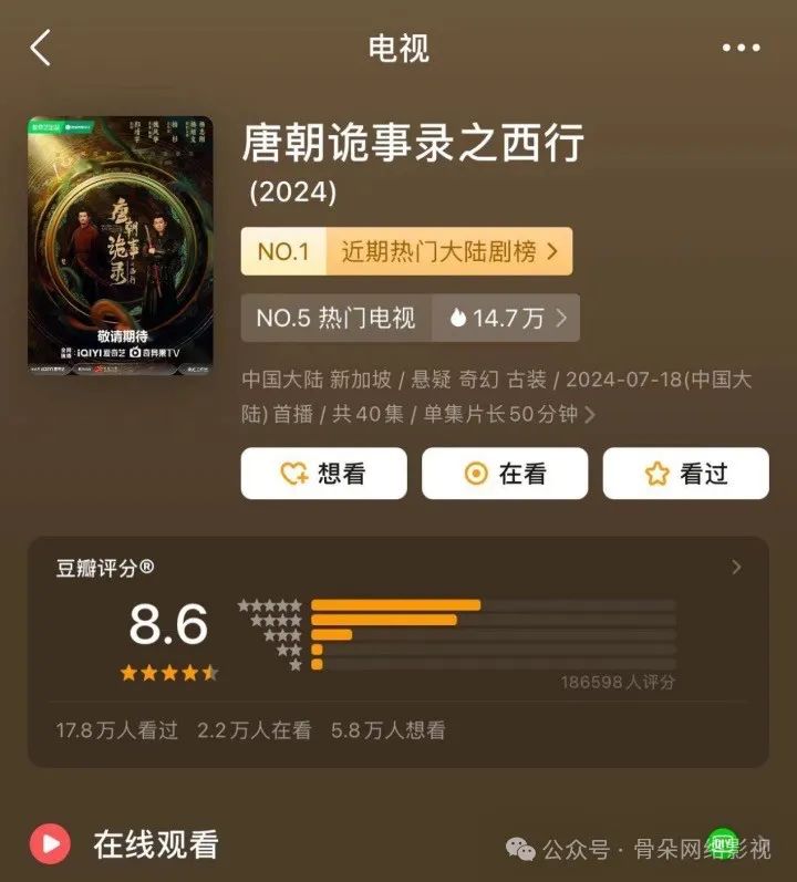 其前作《唐朝诡事录》第一季在播出时就曾提振剧集市场,续作《唐朝诡事录之西行》再上一层,不但粉碎了系列剧的魔咒,而且豆瓣评分达到8.6分,成为今年暑期档剧集口碑TOP1。同时狂揽各大数据榜单TOP1,IP续作有这样的成绩难能可贵。