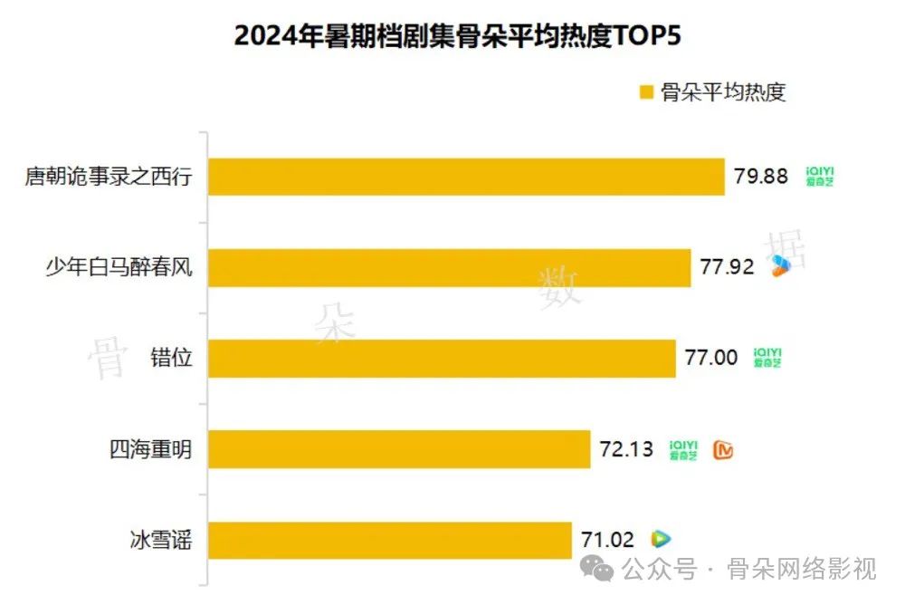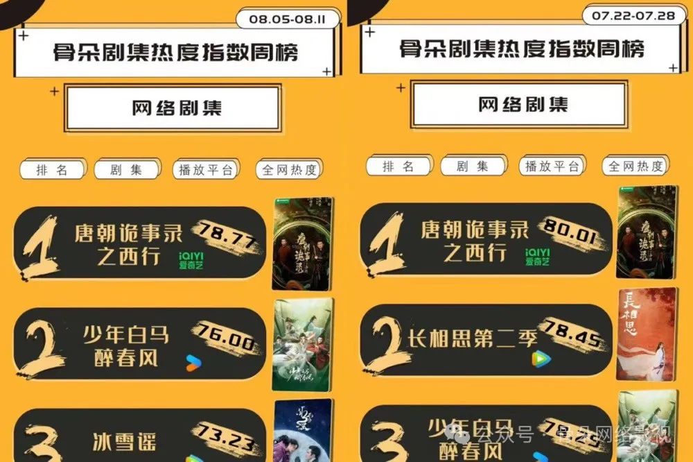 热度方面,《唐朝诡事录之西行》没有流量演员加成却在8月霸榜骨朵网络剧日榜,平均热度值达到79.88,超过同期播出的《少年白马醉春风》《冰雪谣》,成为2024年暑期档剧集热度TOP5榜单的榜首。