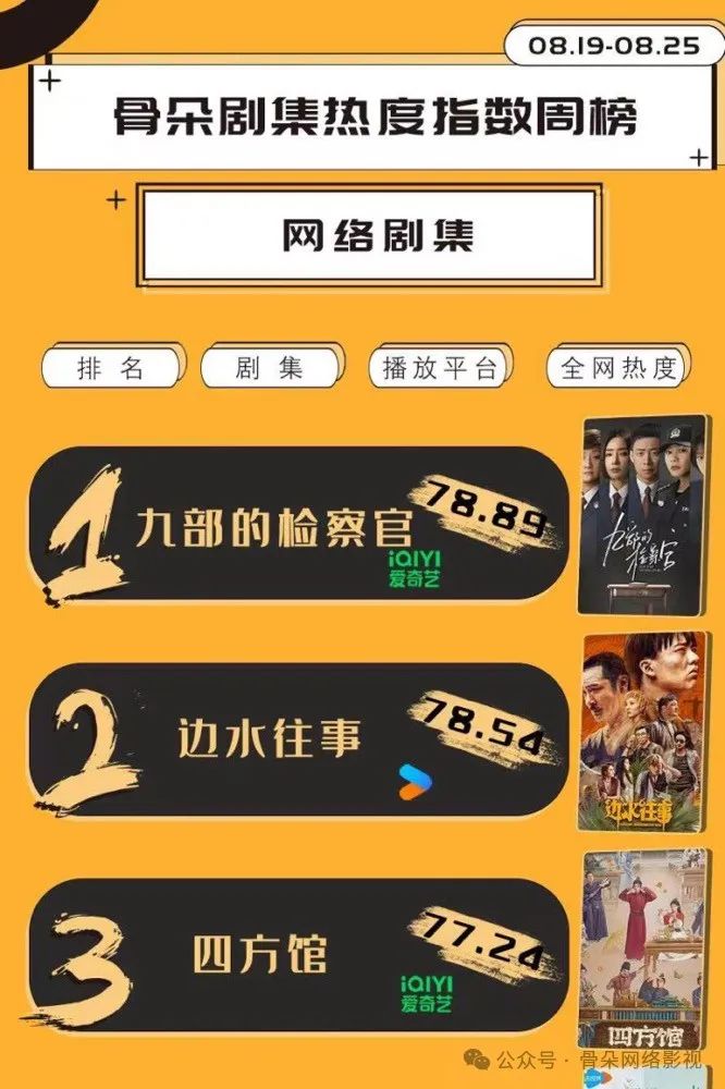 《唐朝诡事录之西行》《错位》《四海重明》之外,突破爱奇艺站内热度9000的《九部的检察官》验证了现实主义剧集更易出爆款的论调。在上线第二天空降骨朵网络剧日榜第二,第三天便拿下第一的位置,热度增长速度之快令人惊叹。