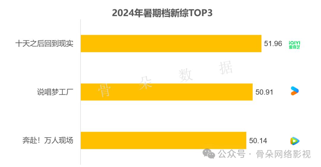 剧集热播的同期,爱奇艺在综艺市场上的突围之势也不容小觑。沉浸式闯关综艺《十天之后回到现实》在录制期间就频频登上热搜,开播后长期占据骨朵网综热度日榜的前排。在2024年暑期档新综热度TOP3榜单里,《十天之后回到现实》更是以平均热度51.96稳稳位居第一。